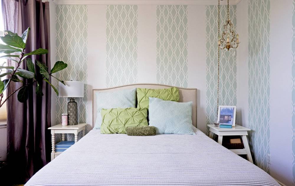 В спальне достаточно сочетания 2 цветов с дополнительными полутонами. За кроватью клеят полотна с большим рисунком, на других стенах однотонные с вертикальными полосками.