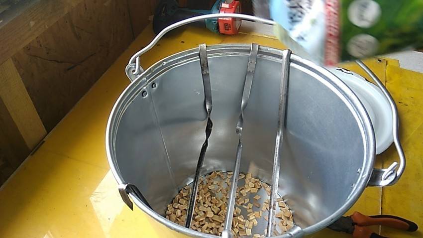 Чтобы сделать простейшую коптилку горячего копчения своими руками, применяется стальное ведро (нельзя использовать цинковый металл). В емкость помещается две сетки из нержавейки. Их расположение должно быть в середине ведра. Первая по центру, а вторая на 15 см выше первой. Днище ведра усыпается деревянной фруктовой стружкой слоем 2 см. Далее, кладется продукт для копчения.