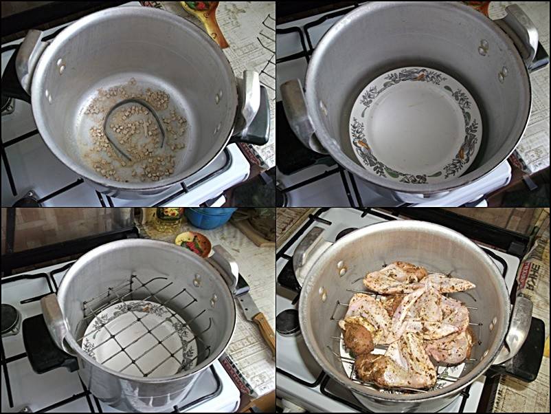 Можно взять обычную эмалированную коптильню из кастрюли. На дно кастрюли насыпается щепа. Посередине кастрюли устанавливается сетка, на которой будет лежать мясо для копчения. Если сетки нет, то можно взять пельменницу, которая уже не используется.