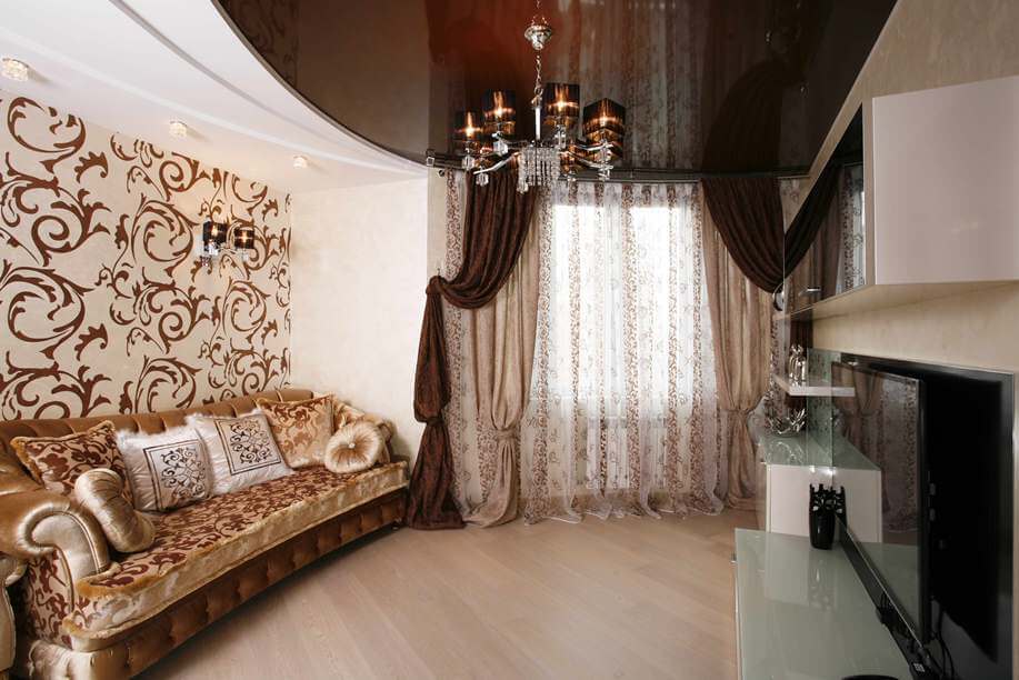 Коричневые или бело-коричневые потолочные модели, сделают обстановку в гостиной более приятной и комфортной и привнесут в атмосферу спокойствия и уюта.