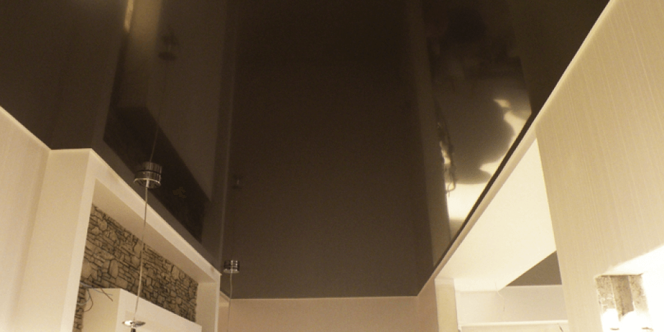 - Глянцевый шоколадный натяжной потолок будет отлично смотреться в интерьере любой части дома, если там достаточно света.