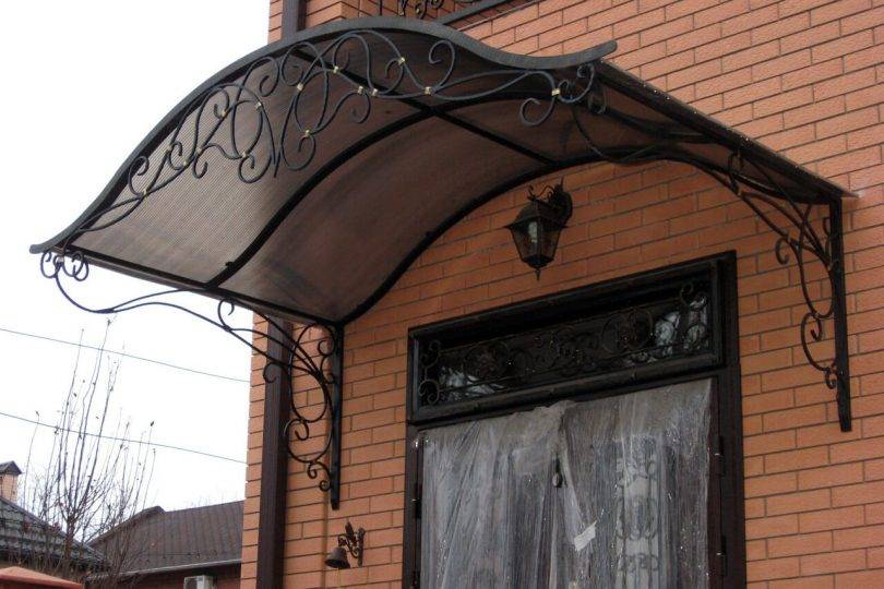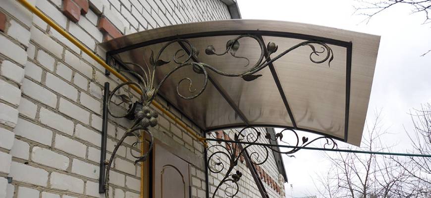 Опору для монтажа козырька можно сделать не только из дерева, но и из металла. Чаще всего используют профтрубу квадратного сечения. На ее основе можно сделать простые кронштейны или изящные навесы для дверей, собранные из гнутых деталей. Металлическая опора хорошо подходит для кровли из пластика: тонкие детали пропускают много света и козырек получится воздушным и легким.