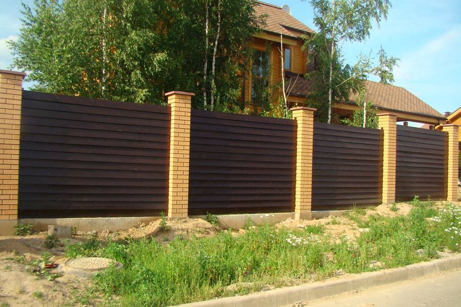 Такого типа ограждения выполняются с созданием мощного фундамента и опорных столбов из бетона или кирпича. Дерево здесь применяется в качестве дополнительной декоративной составляющей. Такой забор проще сделать по внешнему виду похожим на общий ландшафт или фасад строения.