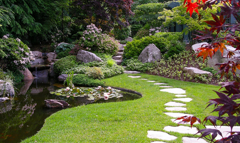 Красивый сад с водоемом и китайским кленомИсточник greenmast.ru