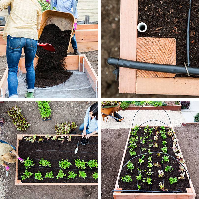 Шаг 3. Засыпьте короб почвой, зафиксируйте шланги для системы капельного полива. Высадите рассаду. Если нужно – установите дуги для укрывного материала. Все, ленивая грядка готова к использованию!