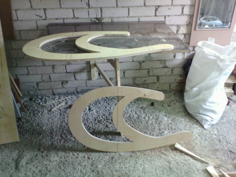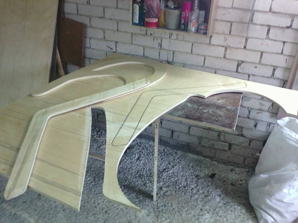Более интересные модели проще всего изготовить в домашних условиях из фанеры толщиной не менее 15 мм. Общая идея довольно проста. Из листов вырезаются боковины по заранее рассчитанному лекалу. К примеру, оно может быть таким: