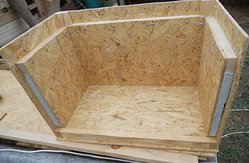 - Боковушки и стенка сзади обшивается доской 30 х 100 мм. Лучше применить фанерку, однако это будет стоить дороже. Обшивка изнутри также сыграет роль утеплителя.