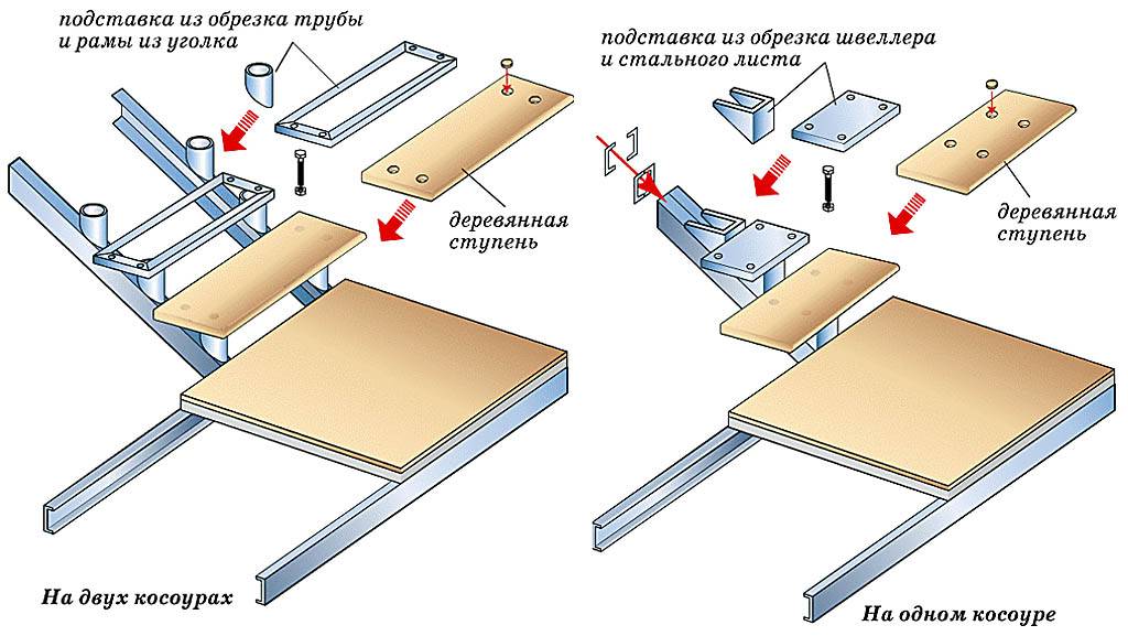 Новичку тут можно выйти из положения несколькими способами. Первый показан на поз. а рис выше: вместо объемных каркасов ступенек на плазе (ровной прочной несгораемой площадке) варятся плоские кобылки под ступеньки. Проступи их – либо деревянные висячие, либо любые (напр. каменные) уложенные в плоские рамы из того же уголка. В том и другом случае проступь или рама для нее крепятся к кобылкам на винтах, что и позволяет выровнять ступеньки. Плоха в этом способе его большая трудоемкость и повышенный расход материала. Деревянные проступи к тому же не получат должной опоры, так что из нужно брать толстые.