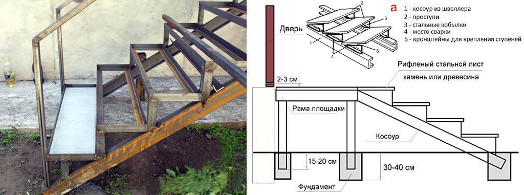 Стальное крыльцо обычно собирают на косоурах так, как показано на рис. Швеллеры на косоуры и раму площадки берут 60-мм; уголок для каркасов ступеней – равнополочный 40 мм. Лаги под настил площадки делают из сваренных в Т-образный профиль (полутавр) таких же уголков. На опорные столбы идут стальные трубы от 100 мм.
