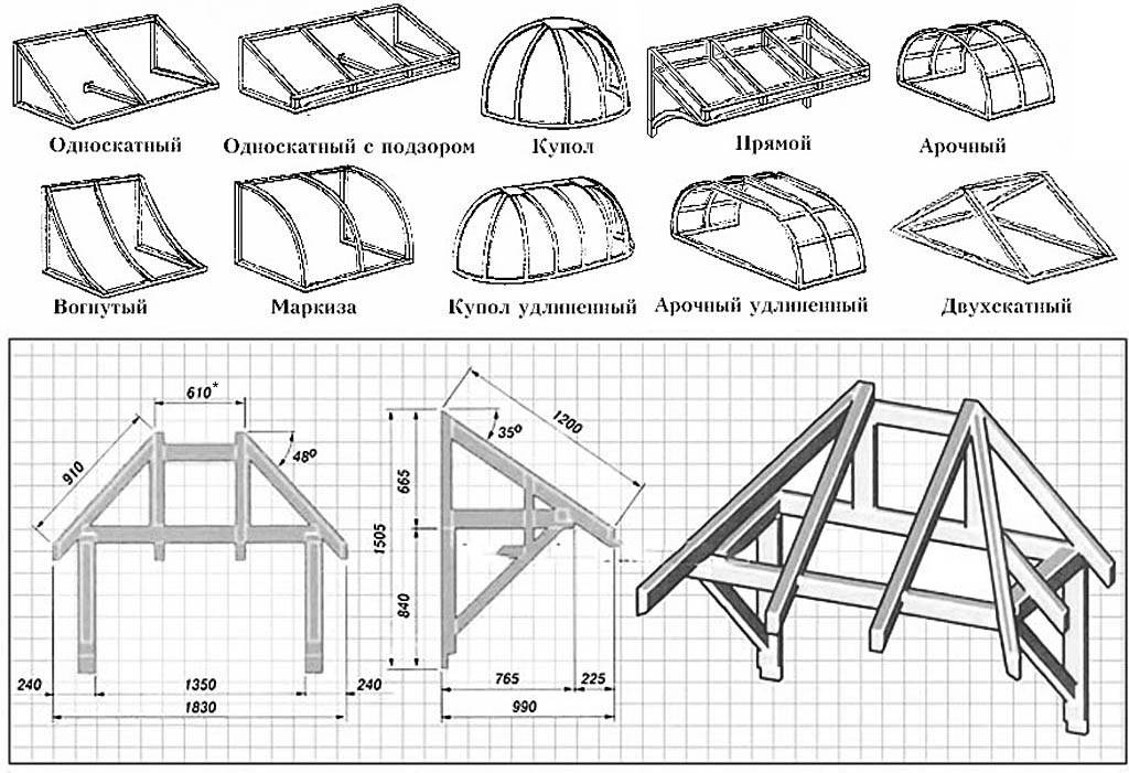 Висячий козырек проблем согласования усадок не создает принципиально. Монтировать его нельзя только на каркасные и сборно-щитовые стены; во всех остальных случаях висячий козырек технически предпочтительнее навеса на колоннах. Схемы сварных из 40-мм уголка каркасов козырьков для крыльца даны вверху на рис., а чертежи деревянного козырька крыльца – там же внизу. Все эти козырьки, кроме арочных и двухскатного, должны быть оборудованы водоотводным желобом с отливом в сторону (в стороны). Габаритная ширина деревянного козырька из бруса 75х75 может быть увеличена до 2,5 м; для этого соотв. увеличивают размер, отмеченный звездочкой.