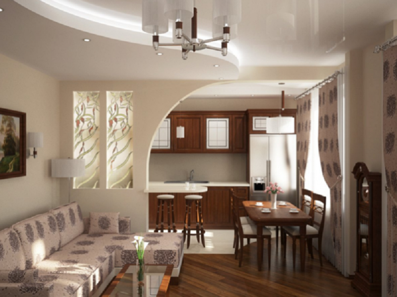 Дизайн кухни с залом приветствует разграничение пространства с помощью натяжных, а также многоуровневых навесных потолков. Уместным будет использование для их отдельных участков разных тонов одного цвета.