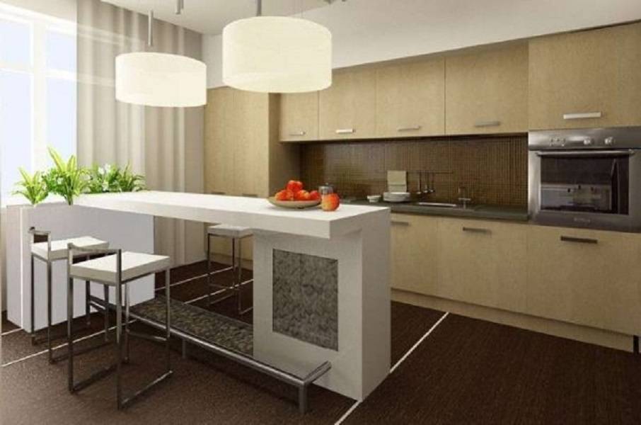 - Барная стойка. Чрезвычайно практичный вариант. Для маленькой семьи она способна полноценно заменить обеденную зону. Дополненная всевозможными держатели и полками, она служит выставочным местом любимых мелочей, одновременно выполняя практическую и декоративную функции.