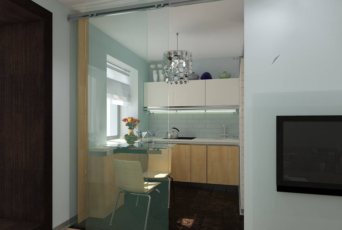 Для этого уместна встроенная техника, только самая необходимая и функциональная. Подоконник (при небольшом выносе) может послужить небольшим кухонным столиком.