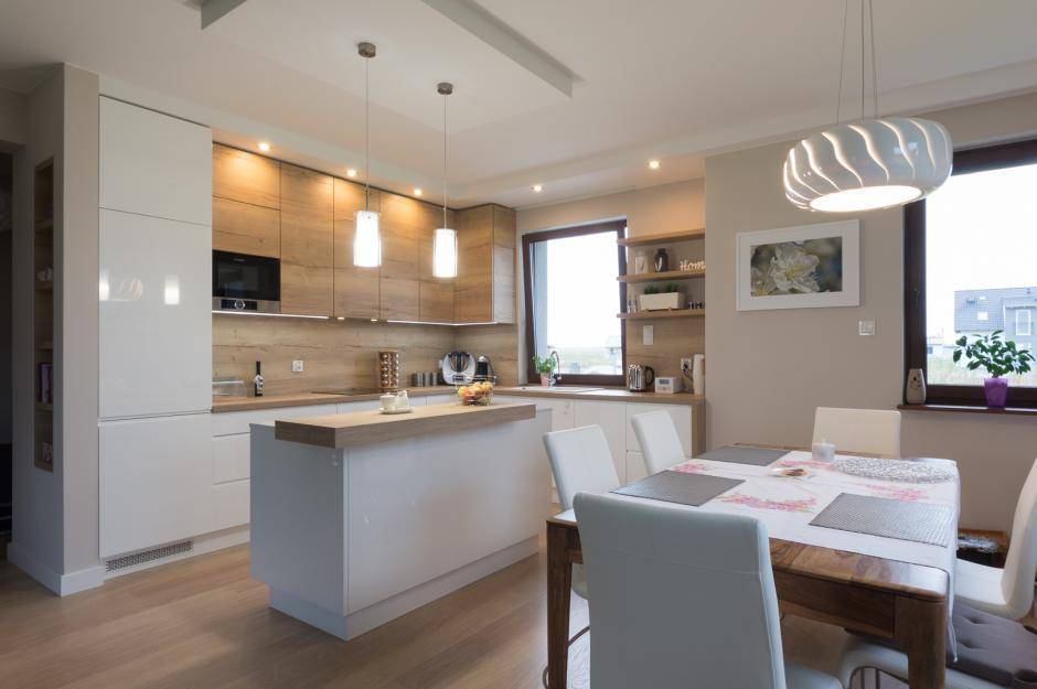 Это достаточно удобно с точки зрения функционала. К примеру, когда кухонный остров соединён с обеденной зоной, либо ограничена площадь пристенного участка кухонного гарнитура.