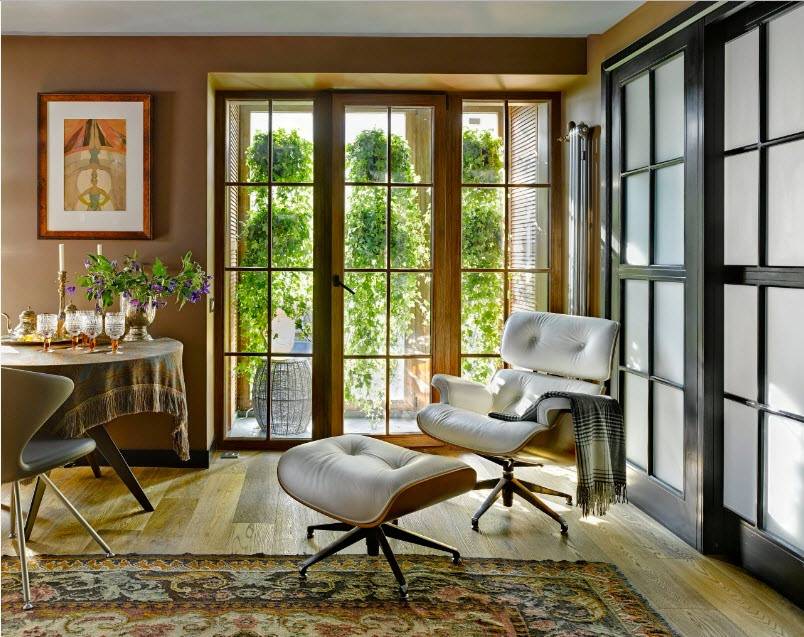 Кухня с зоной отдыха или кабинетом. Объединенную с лоджией кухню можно использовать не только по ее прямому назначению, но и воплощать в реальность оригинальные задумки. Например, здесь можно расположить зимний сад или же мини-бар. Оригинальной идеей будет создание детской площадки, чтобы ребенок был всегда под присмотром матери или же установка личного кабинета. Если эта идея оказалась интересной, и она будет воплощаться в жизнь, то для визуального разделения и создания отдельных зон лучше всего использовать ширмы или «французское окно». Среди альтернативных вариантов можно отметить завесы и оригинальные стеллажи, что будут не только служить перегородкой, но и носить функциональную роль.