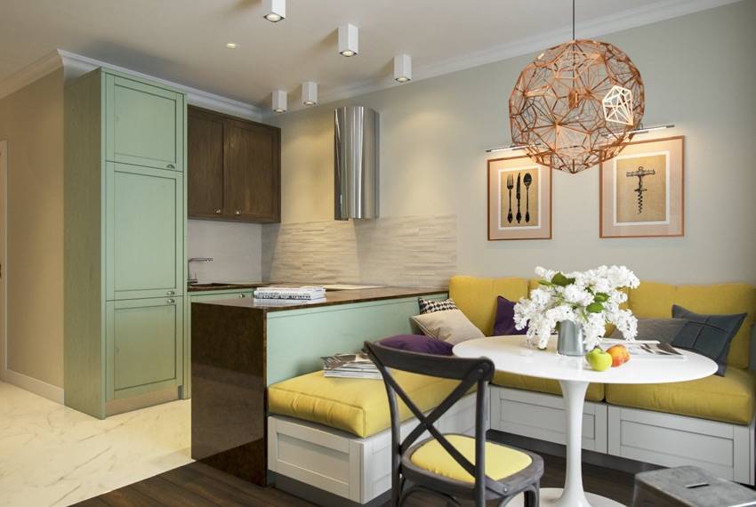 Многие используют в кухнях для квартиры студии столики в качестве элемента зонирования пространства. Если само помещение очень маленькое, а реальные квадратные метры гостиной дают возможность установить в ней стол, можно перенести обеденную зону полностью. Ее можно визуально выделить, например, другим цветом пола и потолка, подъемом уровня.