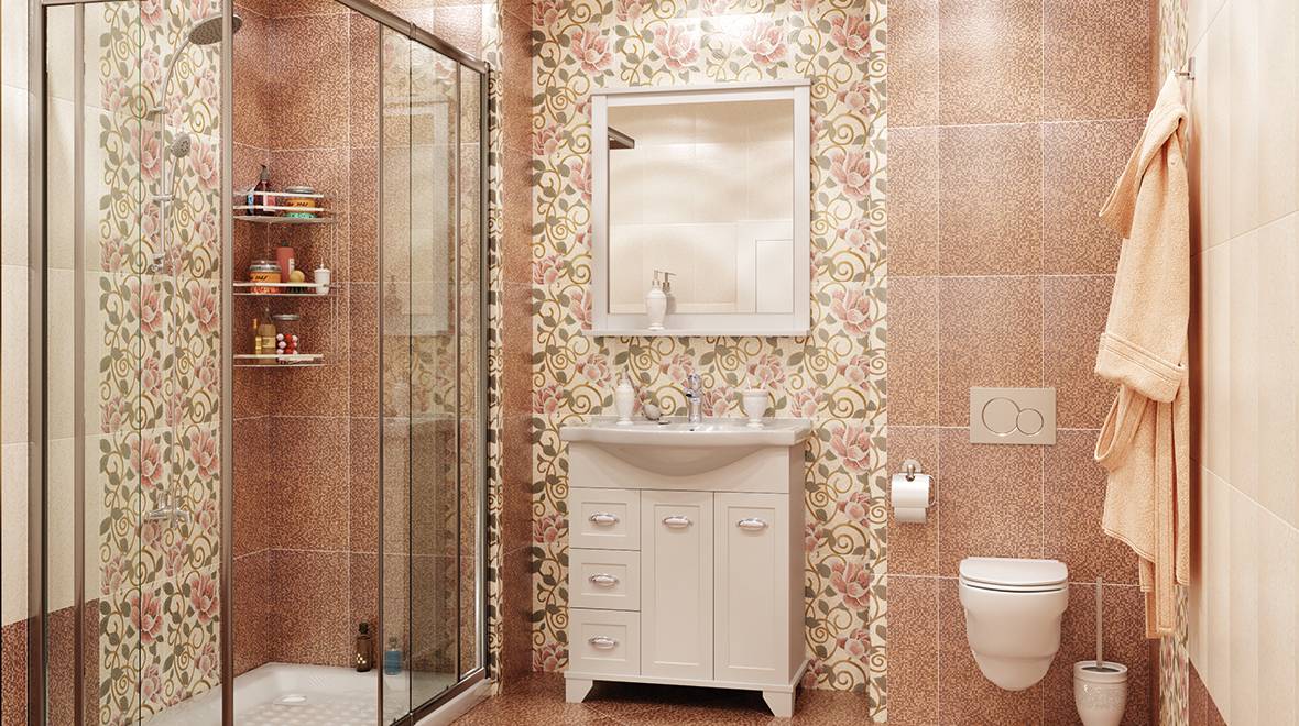 Стены этой ванной комнаты облицованы плиткой из очаровательной коллекции «Bella». Зоны душевой кабины и раковины акцентированы с помощью широких вертикальных полос с нежным цветочным рисунком. Фоном им служит настенная плитка с орнаментом в виде мелкой мозаики в свело-бежевых тонах. Обилие растительных рисунков и тёплые тона делают комнату уютной и будто бы наполняют её солнечными лучами в любое время года.