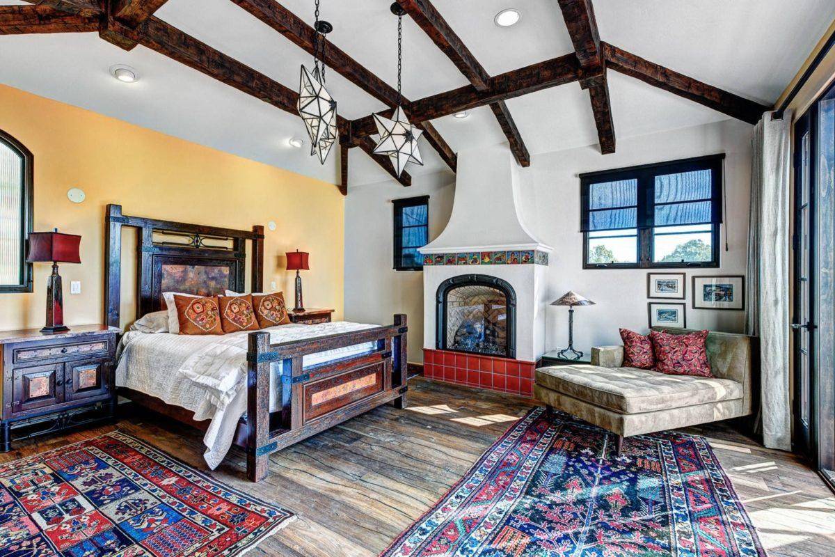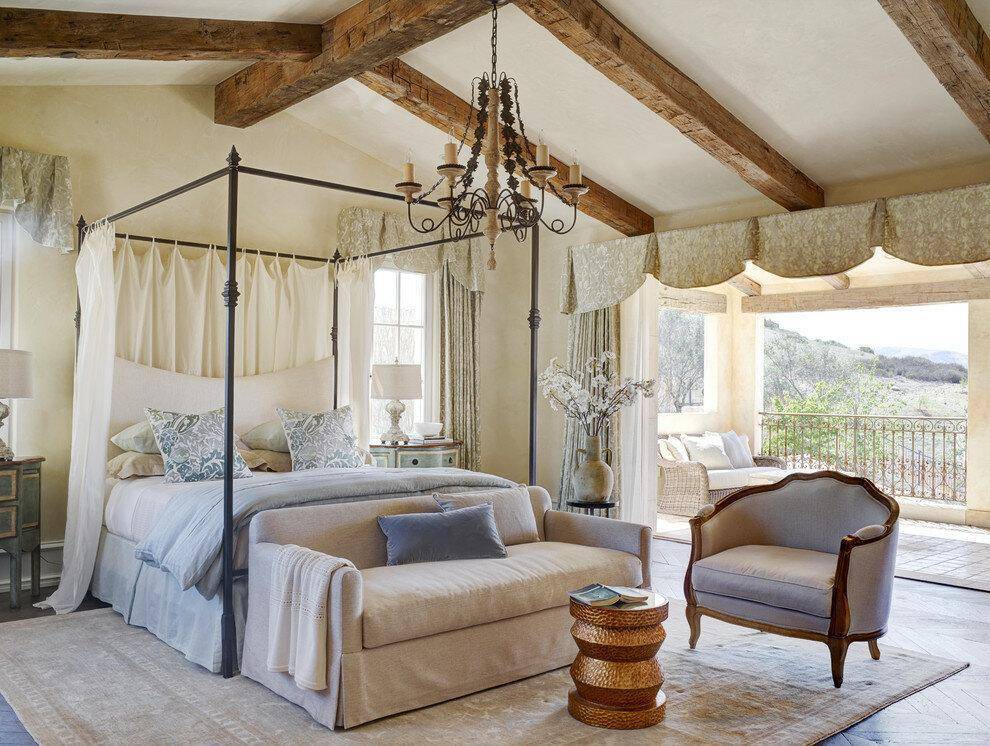 В средиземноморском интерьере не встретишь натяжные потолки или гипсокартонные многоуровневые конструкции. Здесь чаще всего используется простая побелка или покраска в светлый оттенок. Отличительным элементом стиля является использование массивных деревянных балок, контрастного с потолком цвета, обычно – коричневого.