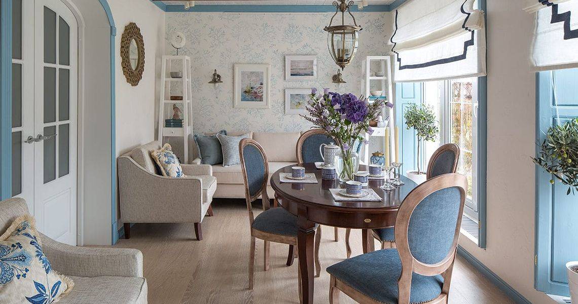 - Гостеприимная атмосфера. Для жителей прибрежных городов характерно радушие и гостеприимство по отношению друг к другу. Их дома всегда открыты гостям, а центральным элементом интерьера является обеденный стол, собравшись вокруг которого, приятно будет пообщаться за бокалом вина и угощениями из морепродуктов. Обстановка помещения должна олицетворять покой, уют и гармонию.