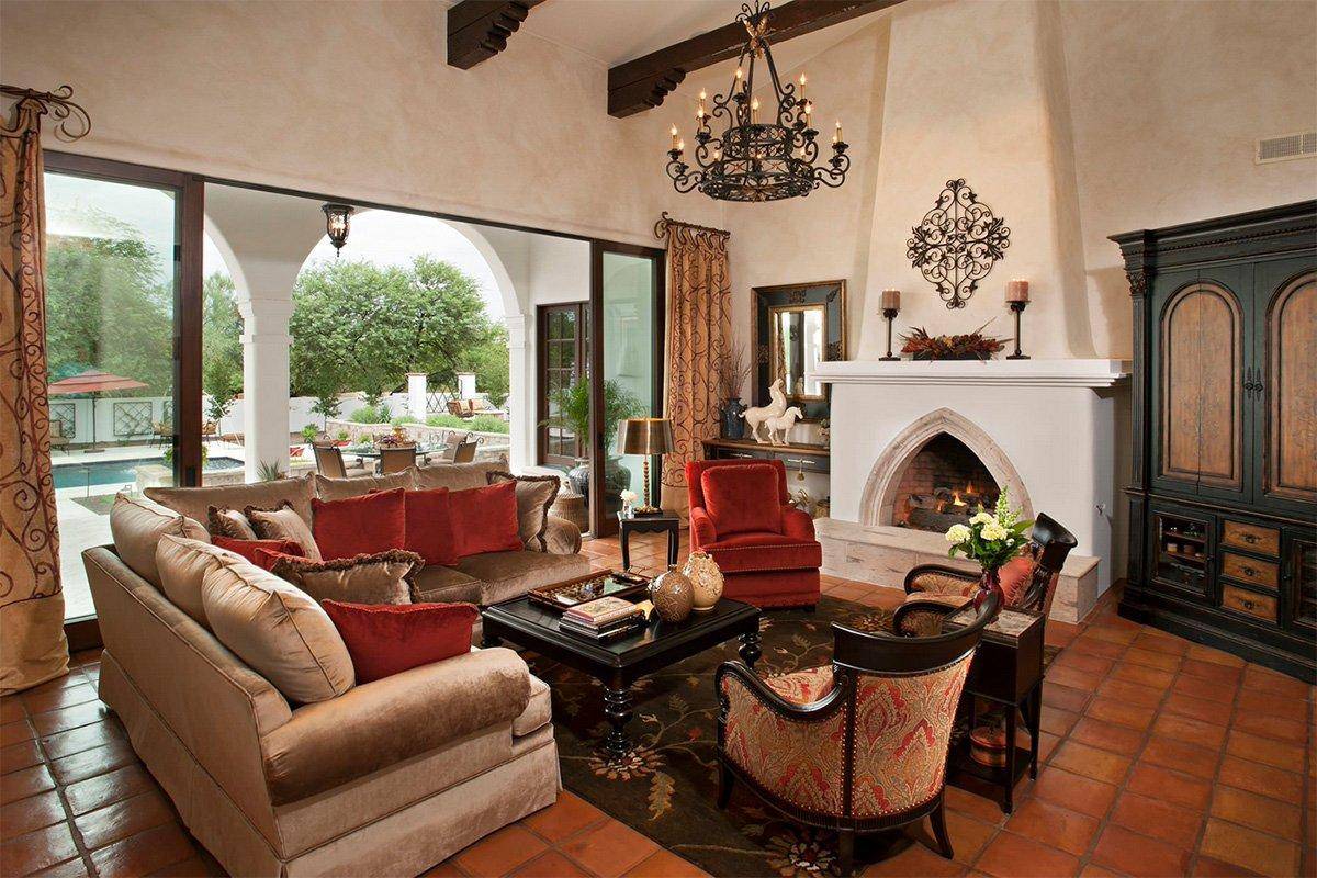 Плавность — особенность испанского направления. Сложные геометрические формы со скругленными углами используются в дизайне мебели, фурнитуры и аксессуаров. В испанских интерьерах потолки часто бывают куполообразными или туннельными, а стены украшают арочные ниши. Интересный дизайнерский прием, присущий испанскому интерьеру, — это оформление потолка под открытый кирпич или его полное остекление.