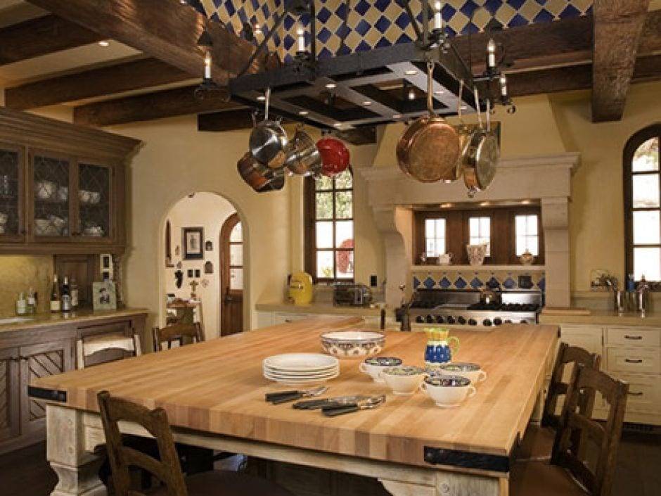 Для средиземноморского стиля характерна островная планировка пространства с расположением мойки и рабочей зоны посередине кухни. Если площадь кухни достаточная, то выбирать следует сразу несколько комплектов, которые подходят для рабочей зоны, места отдыха и принятия пищи.
