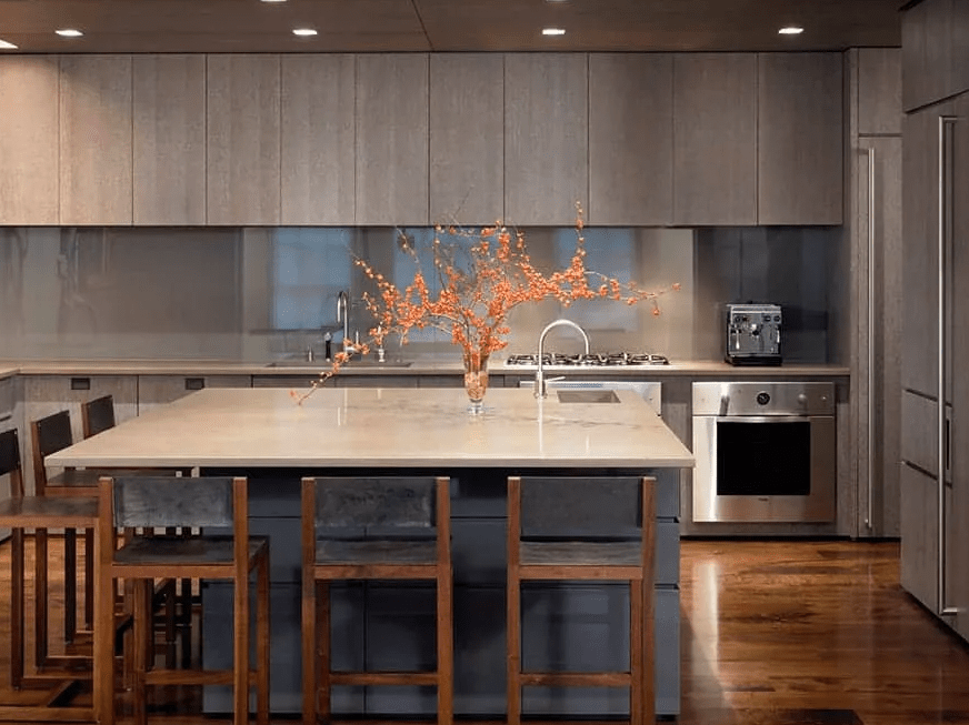 Красиво дополнит интерьер серебристой кухни каменная отделка. Желательно установить в помещении натяжные потолки с матовой поверхностью. В таком исполнении комната станет настоящим украшением дома.