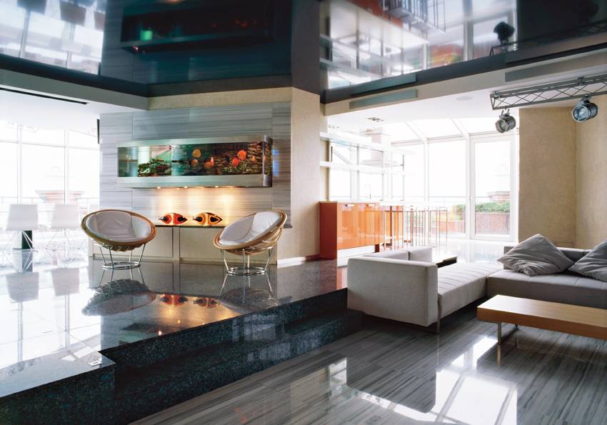 Впрочем, гармонично будет смотреться и глянцевое покрытие. Тем более, что оно отражает свет и визуально увеличивает пространство. Однако имейте в виду, что глянец на потолке вкупе с хромом, стеклом и камнем, рискует сделать интерьер слишком блестящим.