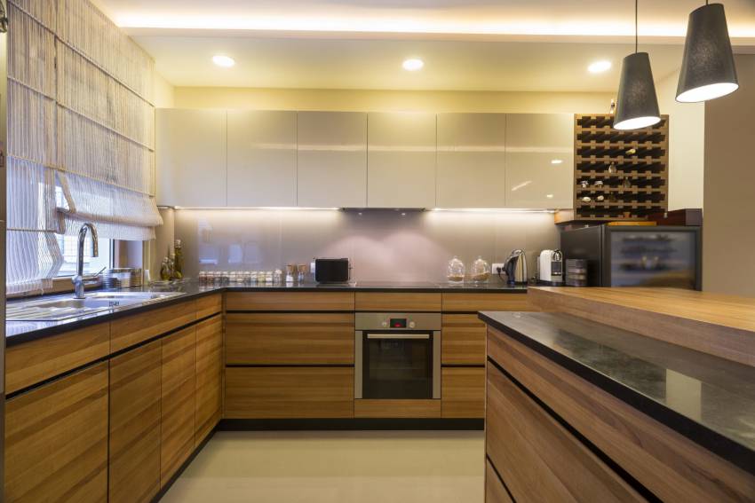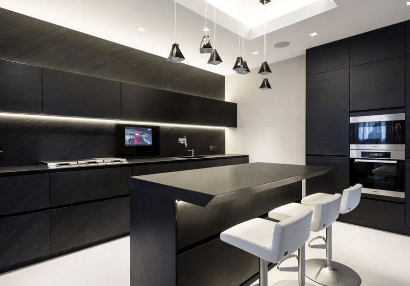 - Холодильник, духовка, вытяжка и микроволновая печь встроены внутрь мебели, сливаясь с ними в единое целое.
