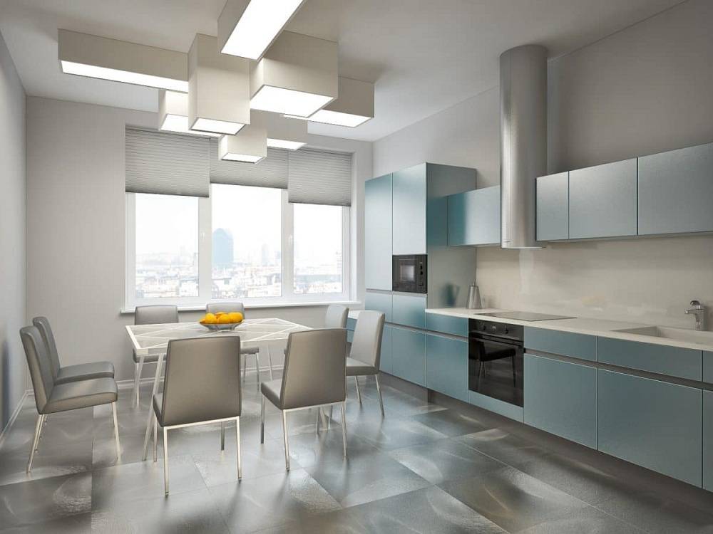Если естественного света недостаточно, то обустраиваются современные многоуровневые системы искусственного освещения. На кухне используются подвесные люстры (если потолки высокие), лампы, врезанные в гарнитур, точечные диоды, встроенные в потолок.