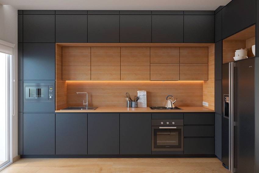 Такая кухня не обладает большими габаритами, но в ней способно поместиться все необходимое, в том числе плита, холодильник, рабочая поверхность, несколько навесных шкафчиков. Для удобства мебель может быть встроена в специально выполненную на заказ мебель.