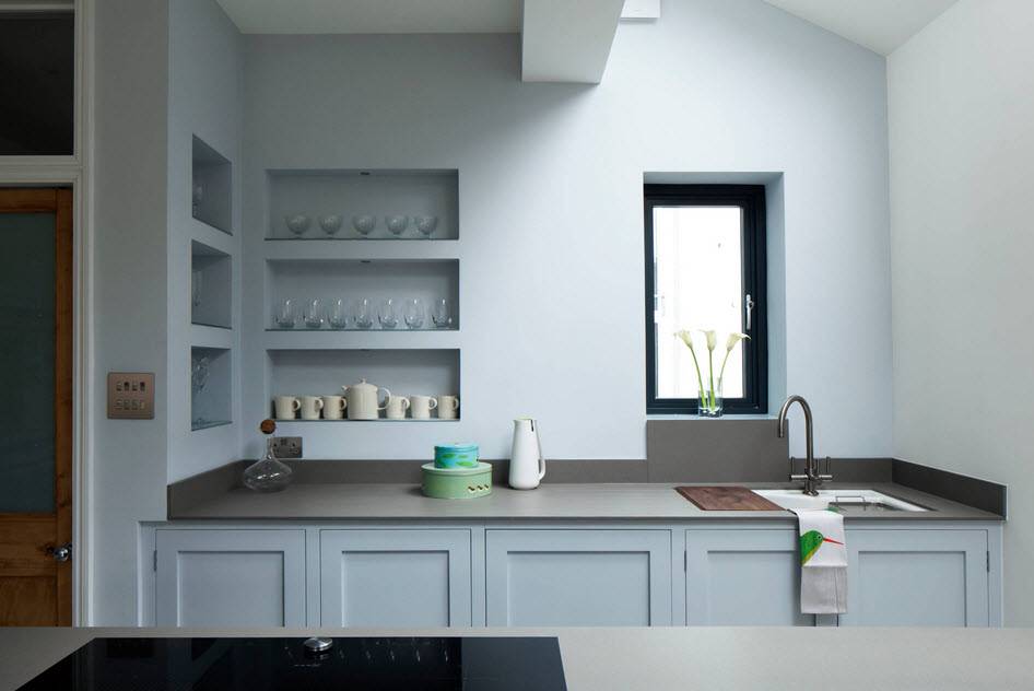 Это углубление в стене по всей высоте, расположенное за раковиной, не мешающей целостности пространства. Ниши имеют глубину не более 15 см и предназначены для специальных шкафов, где хранят посуду. Вследствие малой площади комнаты экономится пространство.