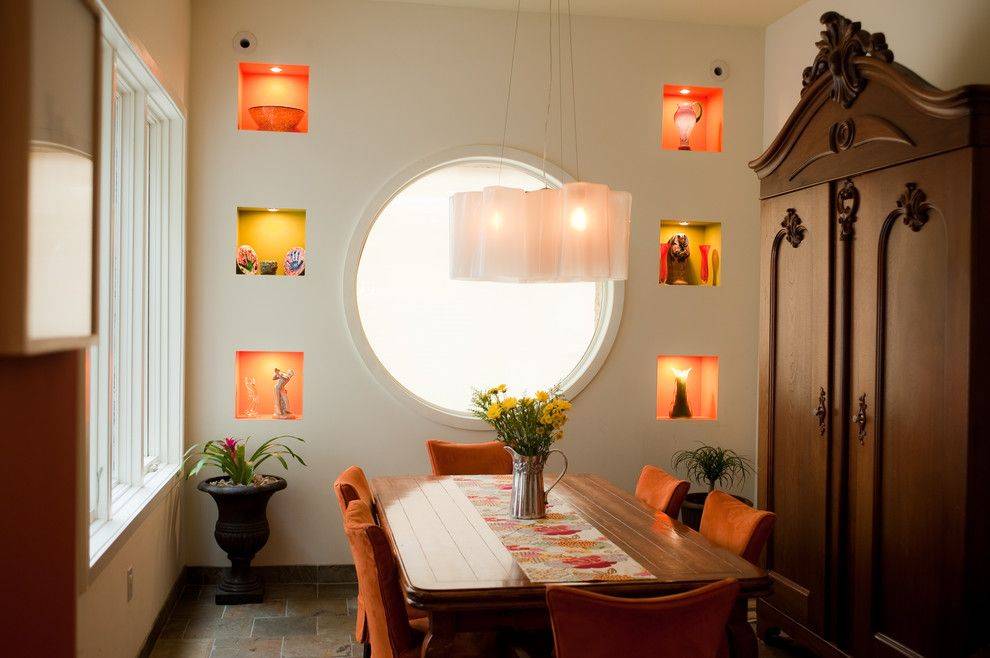 - круглая. В таких нишах располагают стеллажи. Здесь можно хранить кулинарную литературу, но в таком случае стоит позаботиться о шторах, уберегающих книги от запахов и пара. В круглой конструкции можно обустроить сиденье: достаточно обить сооружение мягким материалом с синтепоном. Там удобно пить кофе по утрам и читать любимый роман.