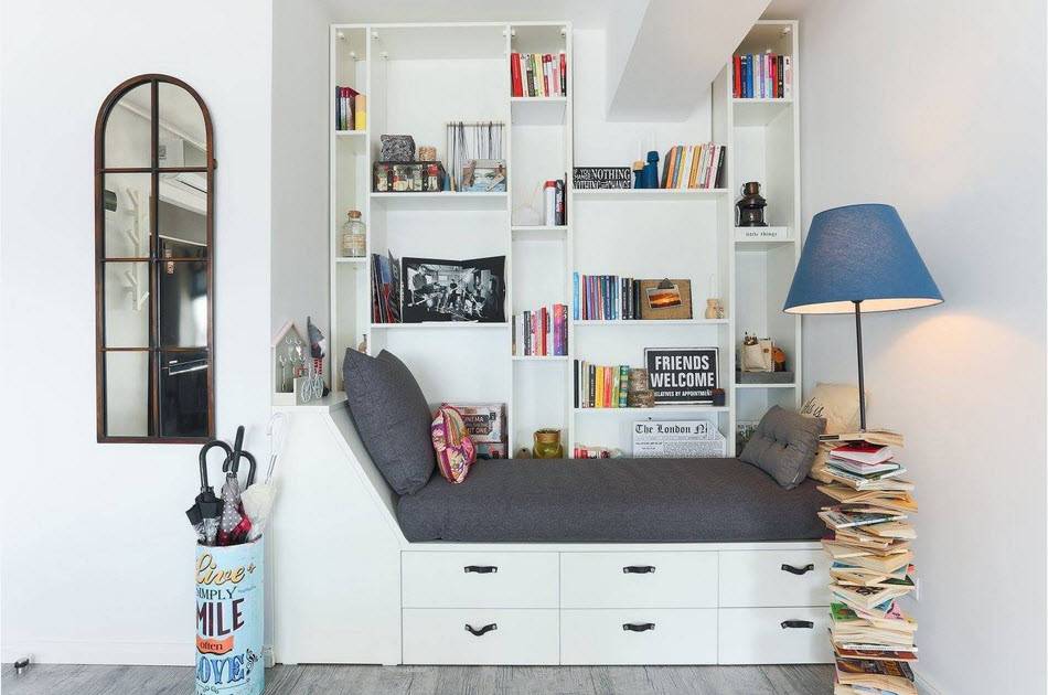 Позволяет сформировать очень практичный и функциональный интерьер, который будет особенно уместен в небольшом помещении, однокомнатной квартире или студии. Глубокий альков с кроватью, оборудованной ящиками для хранения постельного белья, предоставит возможность избавиться от громоздких шкафов и комодов.