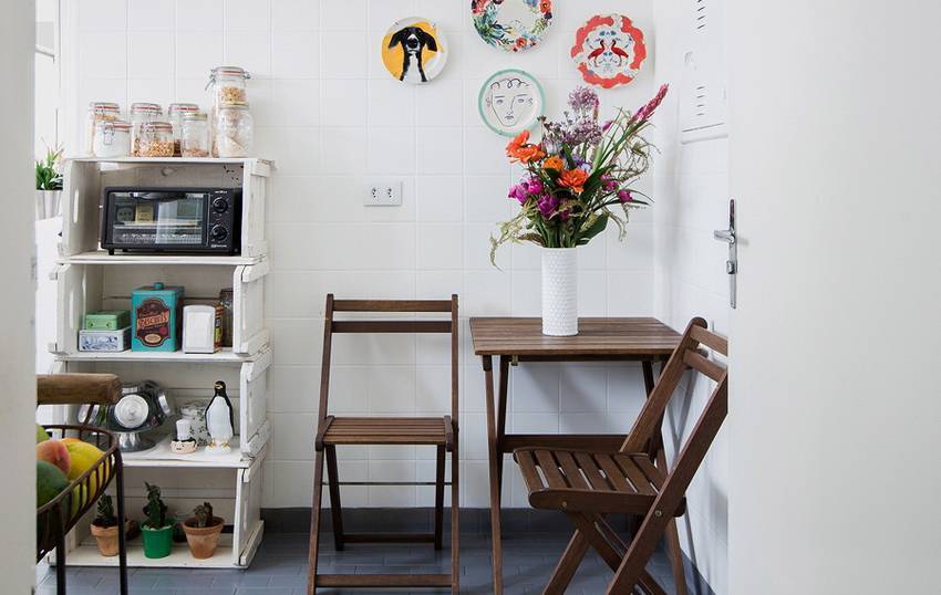 Раскладной стол. Очень удобное решение для приема гостей, особенно если дополнить комплект раскладными стульями. Хранить такую мебель можно на балконе или в кладовке, ведь она очень компактна. Но в любом случае этот вариант является дополнительным, позаботиться о столе на каждый день обязательно придется. Таким вариантом может быть складной настенный столик или барная стойка.