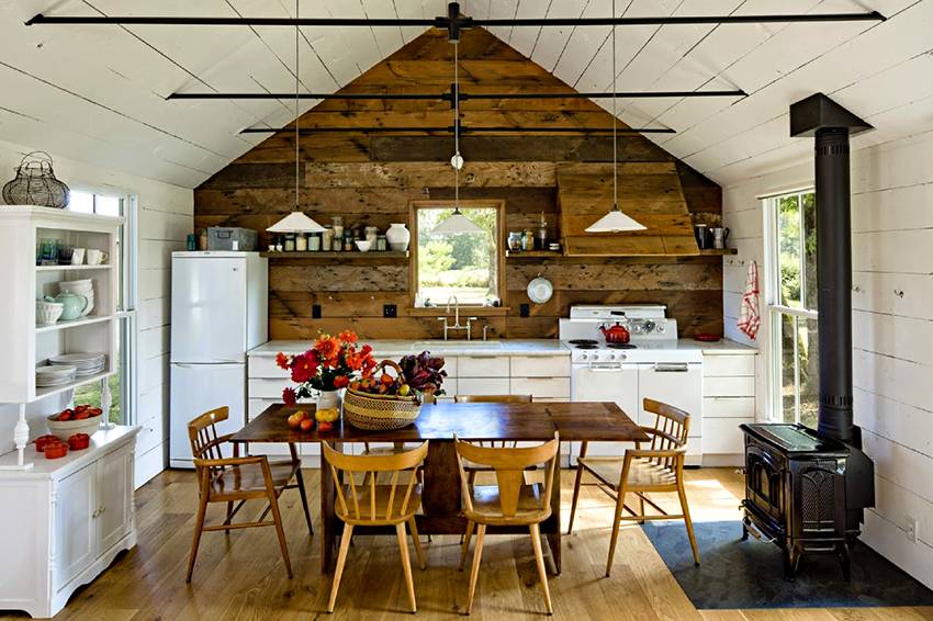 - Сделайте необычное оформление стен в вашей кухне, например, с помощью досок, обшивки, обрешётки и др. Вертикальный рисунок на стенах и шторы от потолка до самого пола делают комнату визуально выше. Сочетание светлых стен и мебели более тёмных тонов зрительно увеличивает пространство и лишний раз доказывает, что тёмные цвета актуально использовать в небольших помещениях.