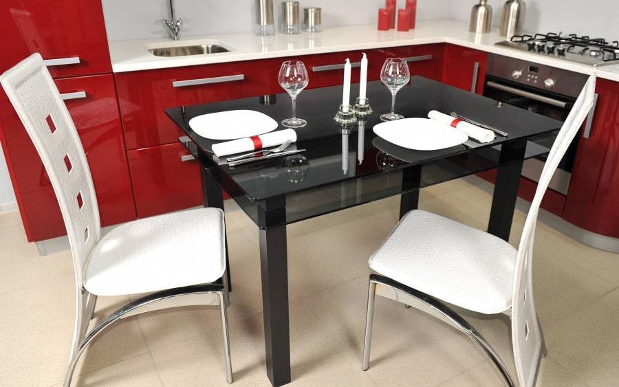 Массивные и габаритные конструкции не подойдут для маленьких помещений. Оптимальное решение – элегантный и легкий стол с тоненькой столешницей и изящными ножками. Толщина крышки изделия не должна превышать 2 см. Но при этом нужно, чтобы эта конструкция гармонично сочеталась с остальной кухонной мебелью и вписывалась в интерьер помещения.