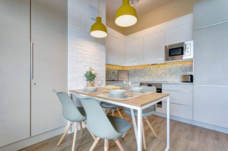 Именно поэтому чаще всего можно встретить минималистичные маленькие кухни в скандинавском стиле, а также современные и классические кухни в белом и других светлых тонах. Светлая кухня в провинциальном стиле с цветочными мотивами также создаст ощущение легкости и мягкости в интерьере. Вы также можете использовать цветную мебель и аксессуары, чтобы добавить нотку цвета в вашу кухню.