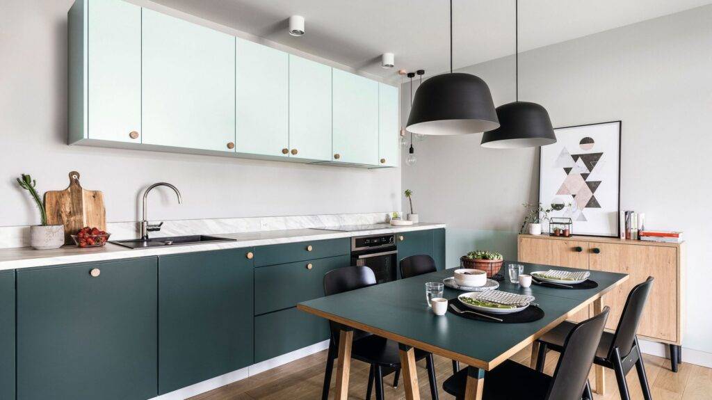 По мнению дизайнеров, в 2021 году в кухонной мебели очень популярны двухцветные шкафы, сочетающие в себе контрастные цвета, такие как белый и черный в классическом варианте или зеленый и синий, разбитые светлой деревянной столешницей или облицованной мрамором стеной.