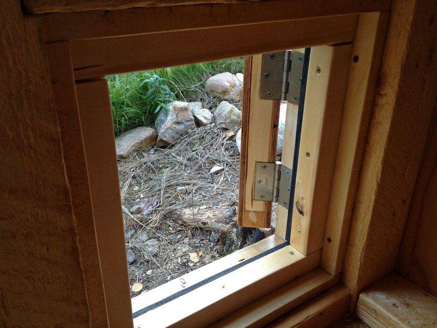 После того как готов каркас, можно приступить к обустройству курятника. В первую очередь намечается и прорезается окно. Делать его нужно с восточной или южной стороны. Прорезается и лаз для кур. Его можно делать в виде дверцы, открывающейся наружу или специальной задвижки.