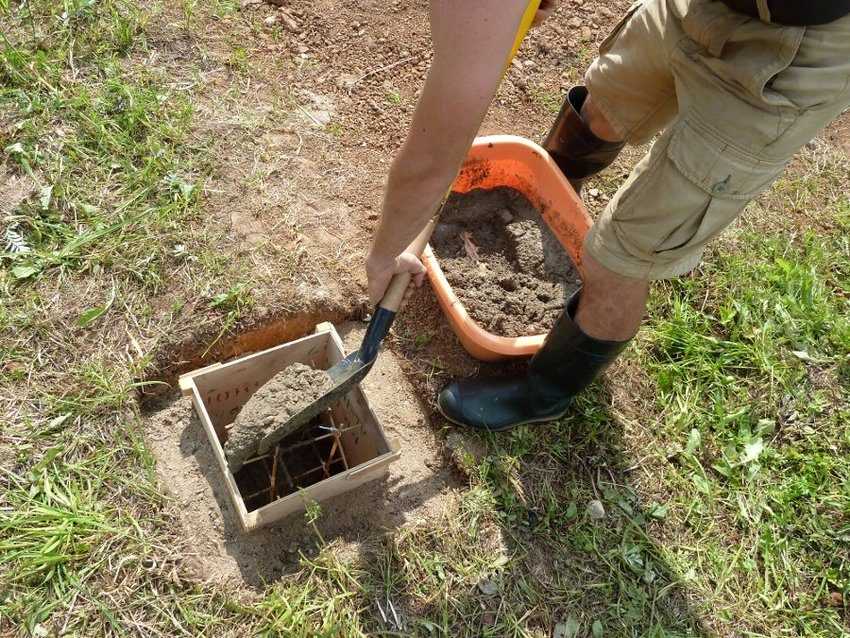- Прежде чем заливать бетон, вставьте в шурфы арматуру с нарезанной резьбой.