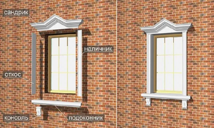 Если говорить о наиболее популярном классическом стиле обрамления окон, то к элементам данной системы относятся такие детали: