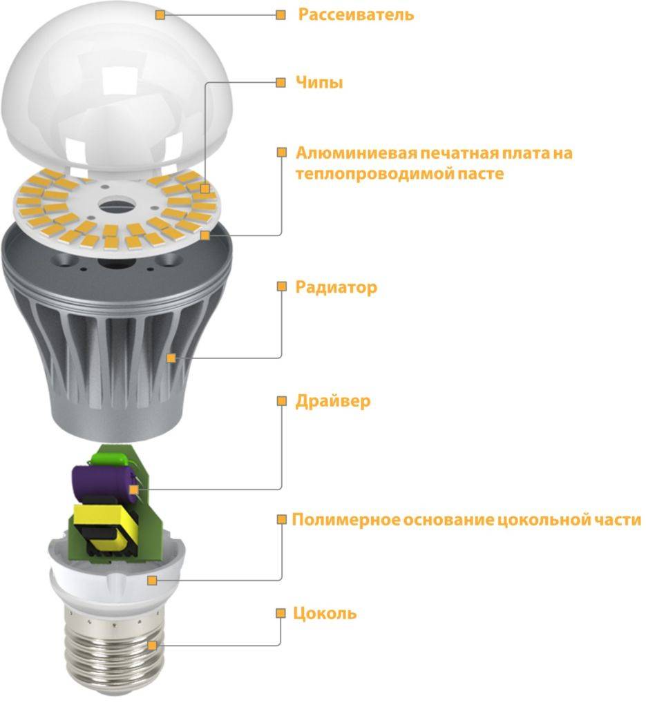 Единственный элемент конструкции, объединяющий все виды ламп, — это цоколь. В остальном конструктивные отличия энергосберегающих устройств от светодиодных существенны.