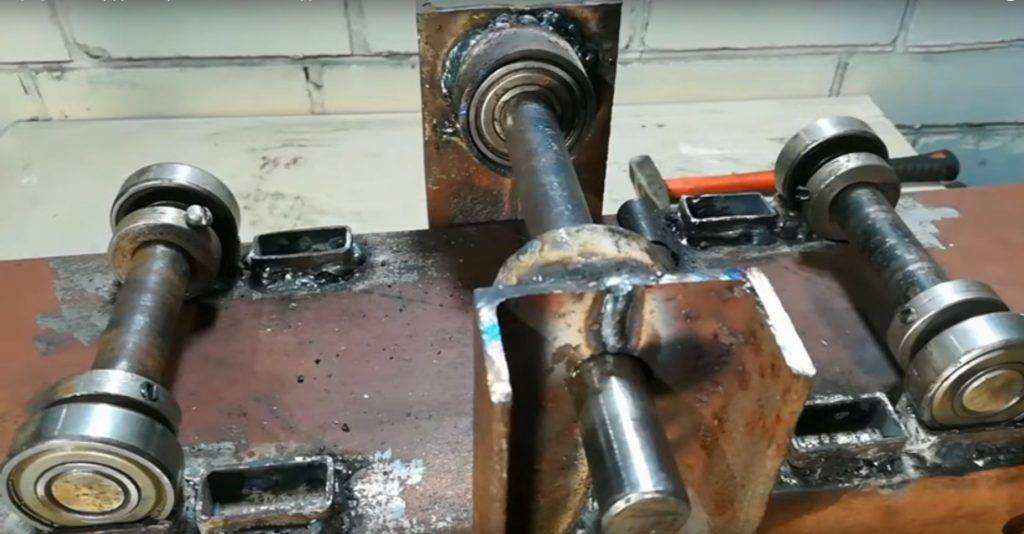 Лучший вариант, это если подшипники применить в уже готовом корпусе. Если нет таких подшипников, то используем любые подходящие без корпуса. Их не обязательно жестко крепить к каркасу трубогиба. Можно сделать под них подставки из профильной трубы или уголков. Ниже на фото представлены различные варианты крепления подшипников.