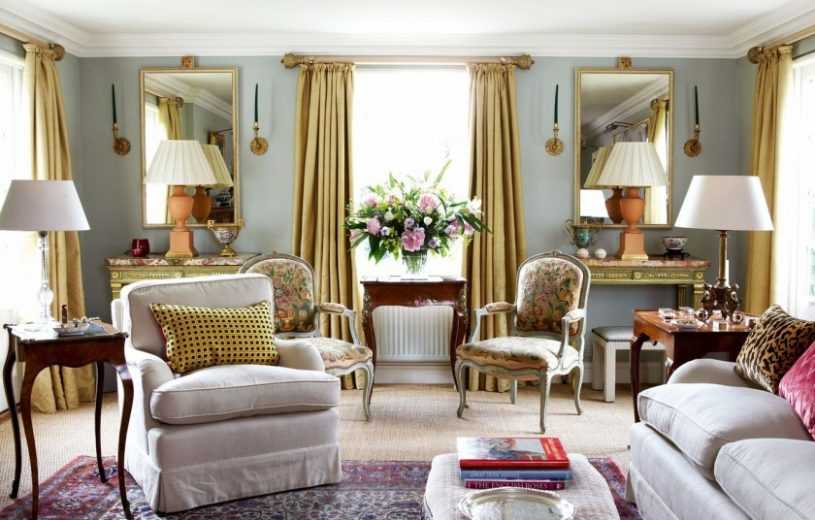 Занавески на окнах легкие, пропускающие воздух, украшенные сборками, бантами, прошвой или кружевом. Там, где слишком много солнца, в ходу плотные гардины, шторы с подхватами из не очень дорогого, но долговечного и натурального материала.