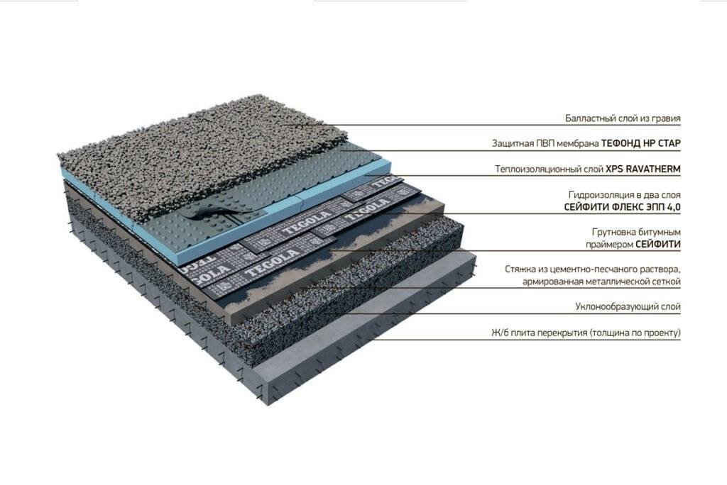 Данный метод применяют при обустройстве плоских крыш, а также в случаях, когда уклон не превышает 15 градусов. В качестве балласта используется галька, щебень, тротуарная плитка или иной материал. Поэтапно процесс обустройства состоит из следующих шагов: