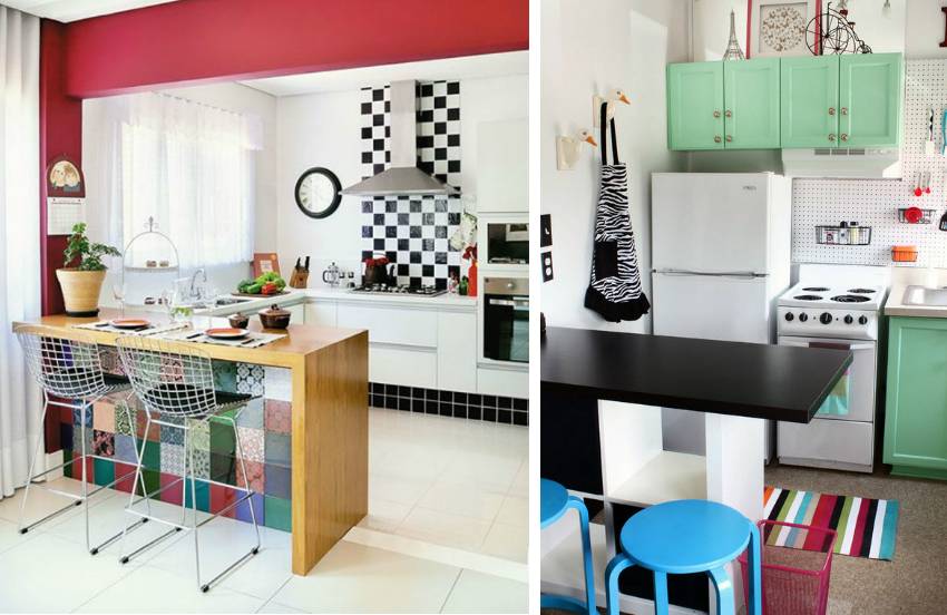 Как уже говорилось выше, главное предназначение малогабаритной кухни в хрущевке — это приготовление пищи. Поэтому обеденный стол можно вынести в другую комнату с большой площадью, а на кухне оставить только рабочие поверхности (плита, микроволновка, миксер, блендер, мультиварка).