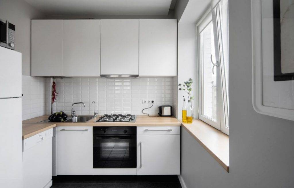 Чтобы использовать имеющееся пространство максимально рационально, рекомендуется сделать выбор в пользу цельной столешницы, в которую будет встроена раковина. Кроме того, для создания дополнительной рабочей зоны можно сделать еще одну поверхность, объединив ее с подоконником. В особенности актуально это в случае оформления кухни-студии в хрущевке.