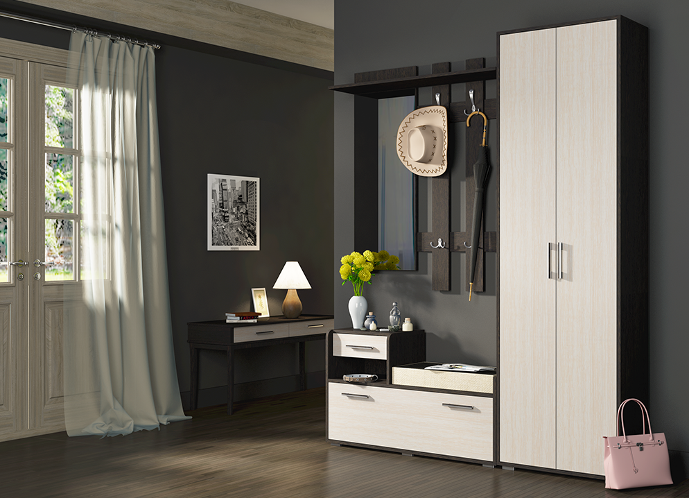 Речь идет о малогабаритных прихожих или коридорах. Тут участок стены, куда можно что-то поставить, может быть всего в метр с небольшим шириной. Если это как раз ваш вариант, вам нужна мини-прихожая. Вешалка с небольшой тумбочкой и комод с зеркалом. Модели мини-прихожих бывают прямыми и угловыми. Некоторые занимают совсем мало места — по 45 см от угла.