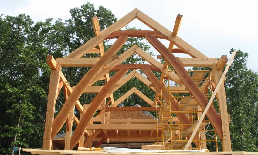 Стропильная система двухскатной крыши для большого пролета и узлы врубки конька и стропил