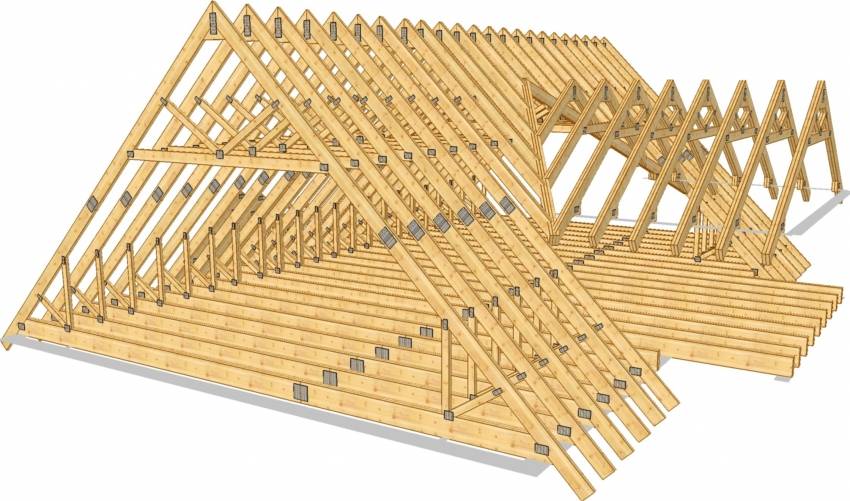 Здесь жесткость обеспечивается накосными (угловыми) стропилами со стойками в середине их длины. Стойки соединяются между собой горизонтальными связями. Нарожные стропила опираются на накосные и образуют прочное основание для кровли.